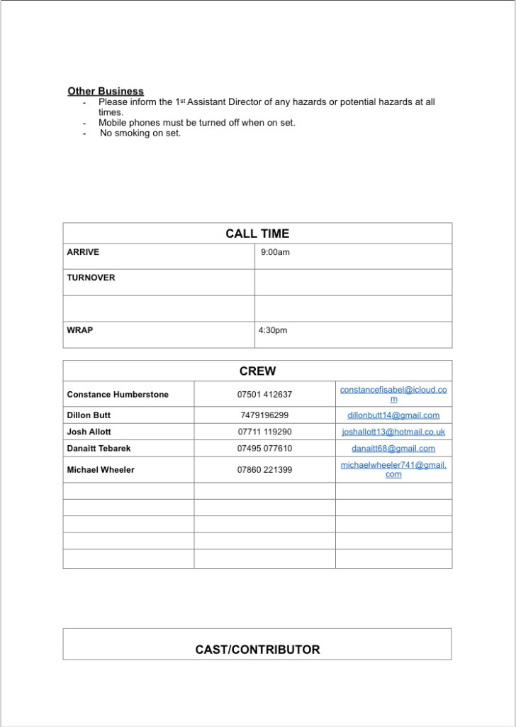 Being the producer I was tasked with completing a risk assessment, shot list and call list.