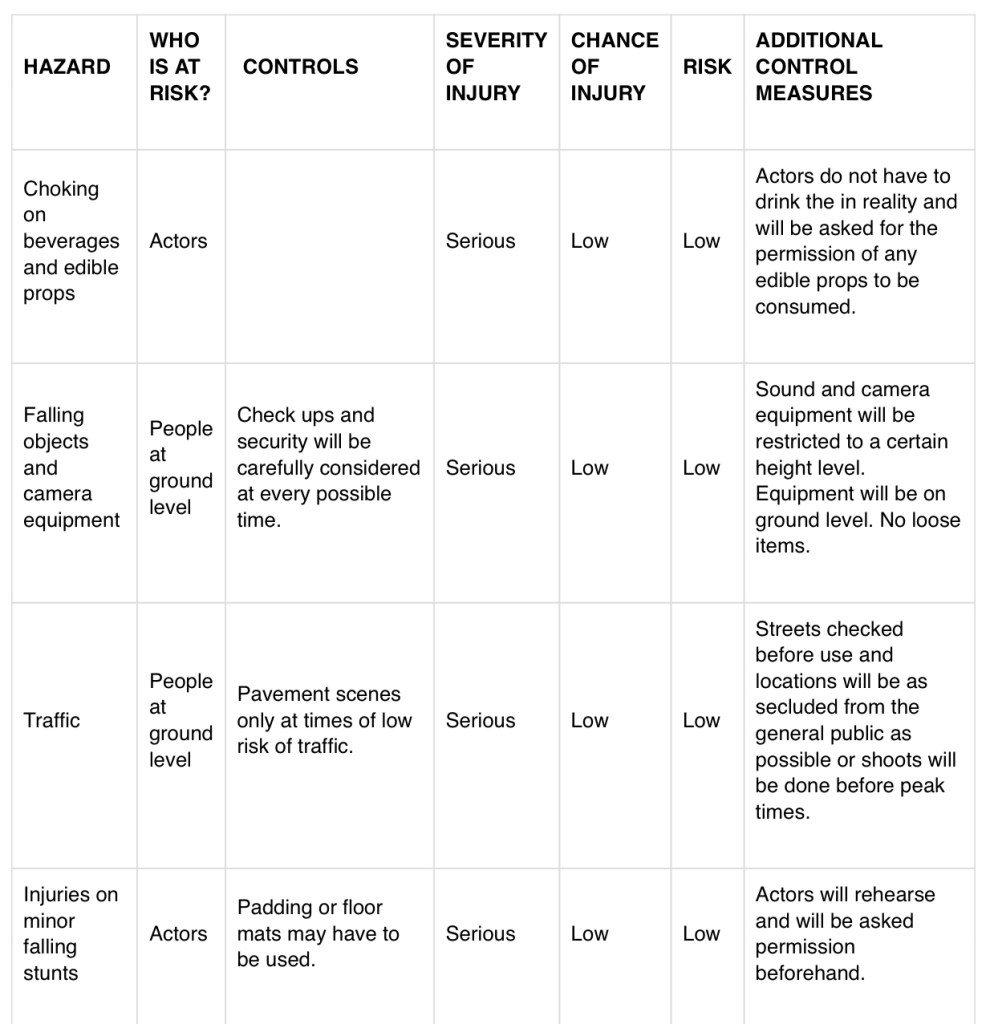 The risk assessment itself I found was more simplified compared to examples I have seen. One, because our film is quite short, and two, because we have only chosen two settings, one being indoors and one being outdoors.